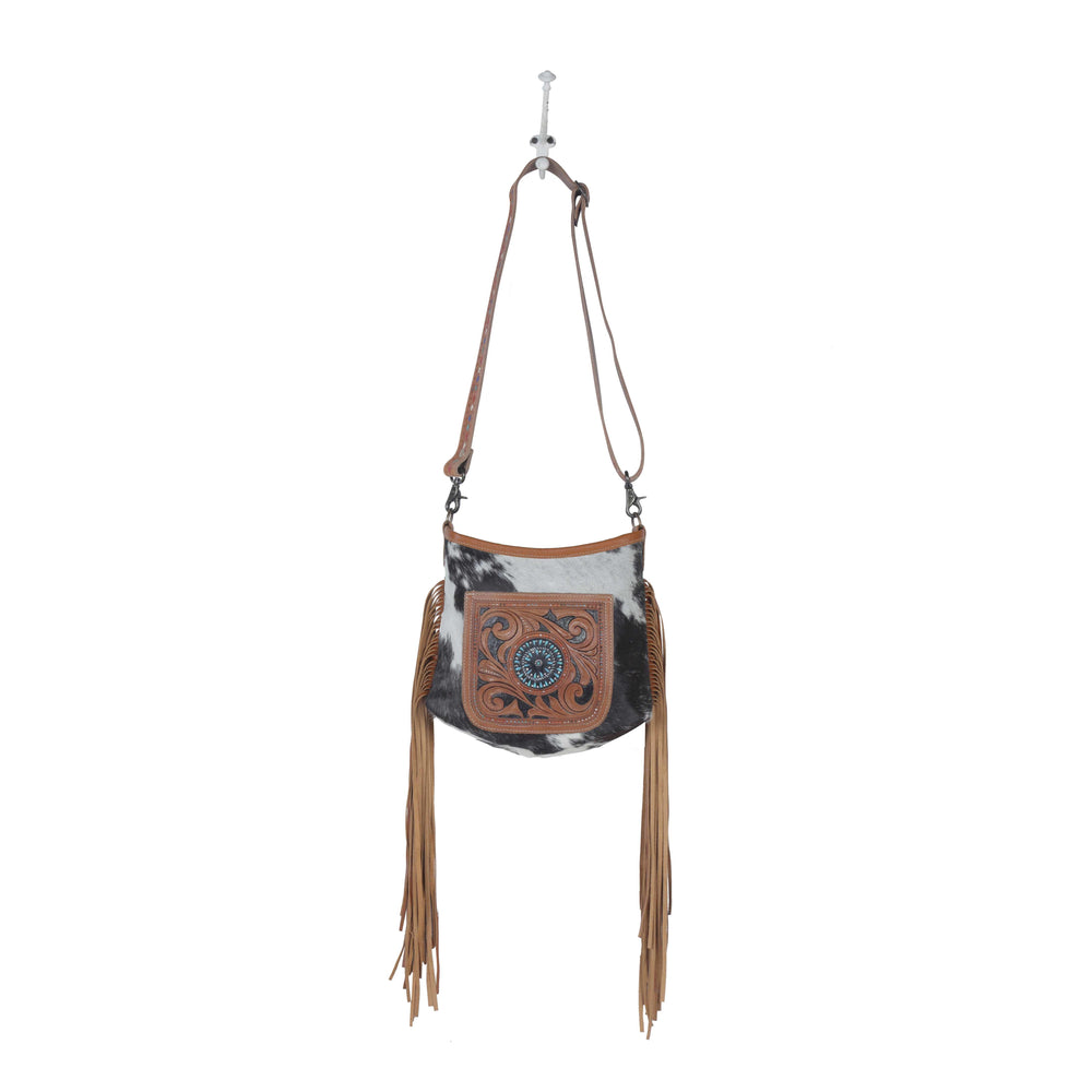 The floral pattern designed from hand-tooling is what lends a regal quality to our bag. The cowhide leather surrounds the floral work and gives it a sturdy built.