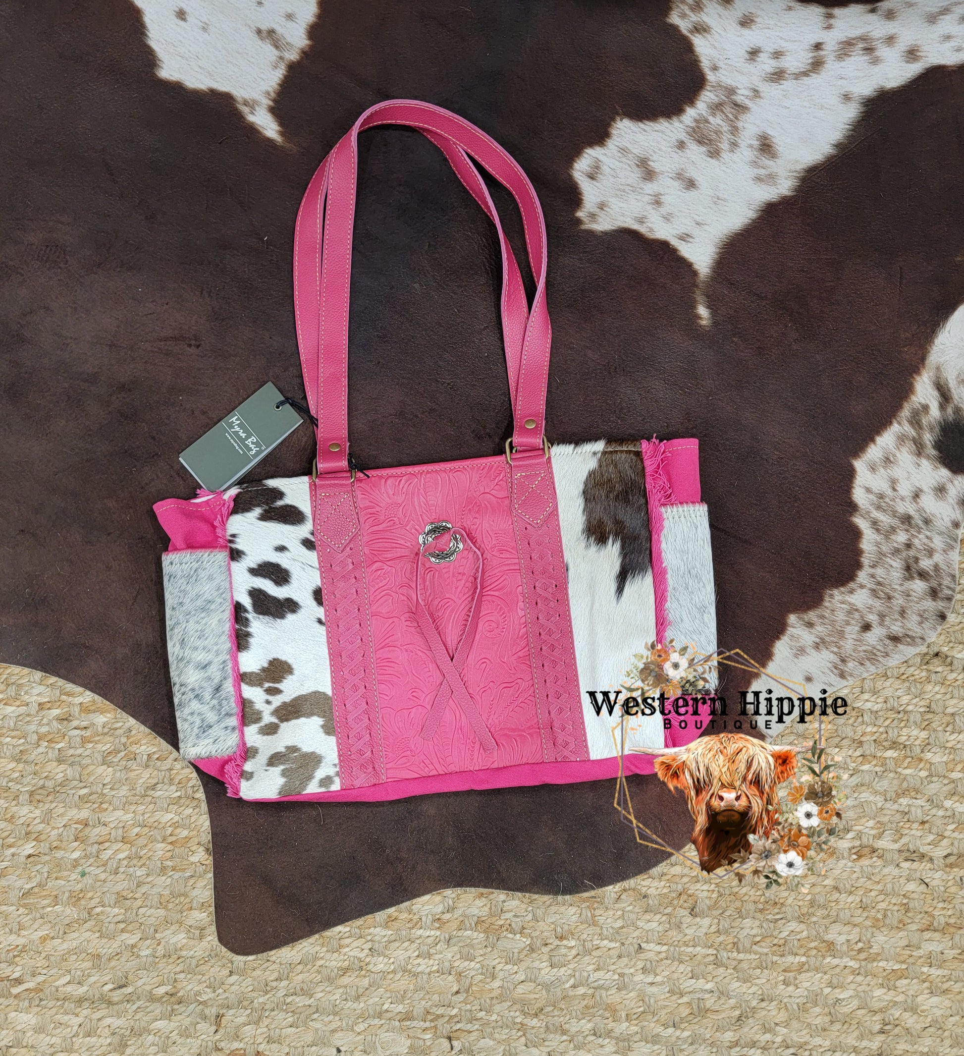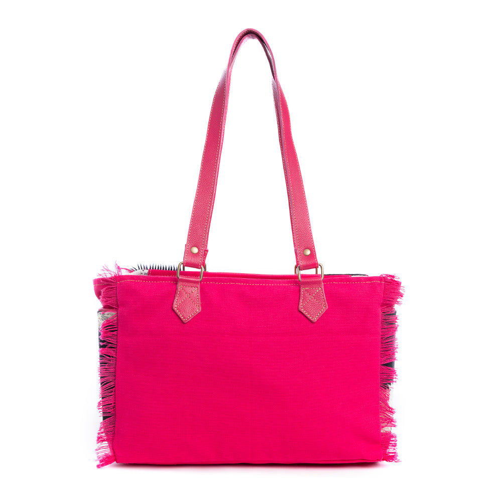 This incredible bag features luscious design anchored in beautiful hair-on hide and front panel of hot pink stamped leather. Special stitching, a tasseled concho accent, and frayed edge treatments complete the look with flair. The back is gorgeous upcycled woven canvas with separate zippered pocket. Zipper-close top. Matching durable carrying strap are in matching leather. You will be noticed and admired!