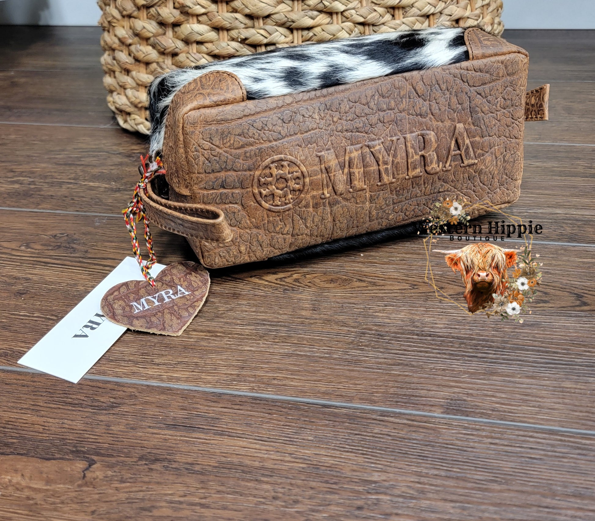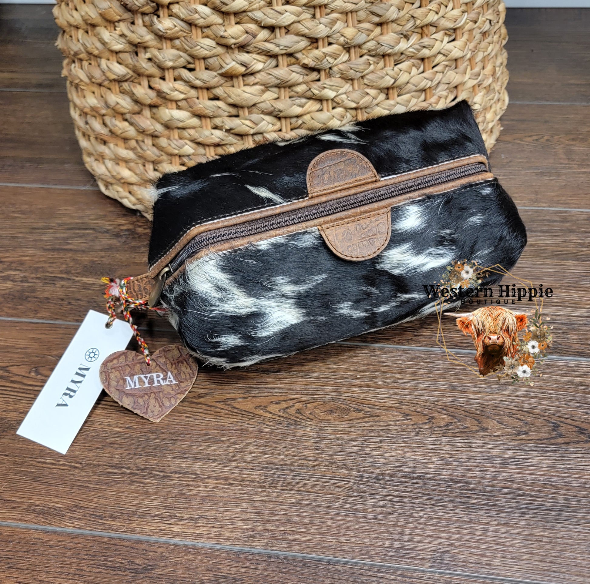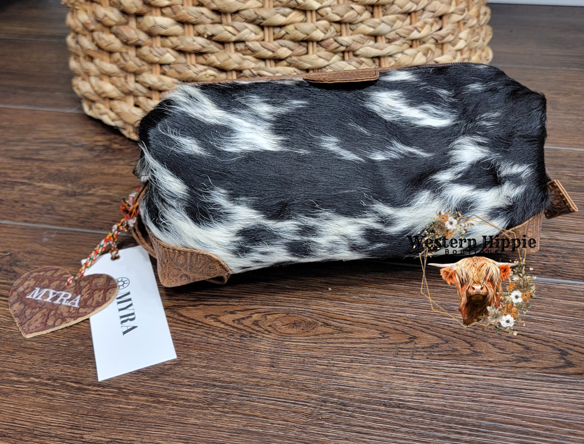 This great bag embodies rustic chic merged with practical luxury. This stunning accessory showcases unique black and white hair-on hide patterns, accented with rich leather trim. Spacious enough for all your essentials, yet compact for easy packing, it's the perfect travel companion for the fashion-forward traveler who values both style and functionality in her daily routine. Zipper-close top.