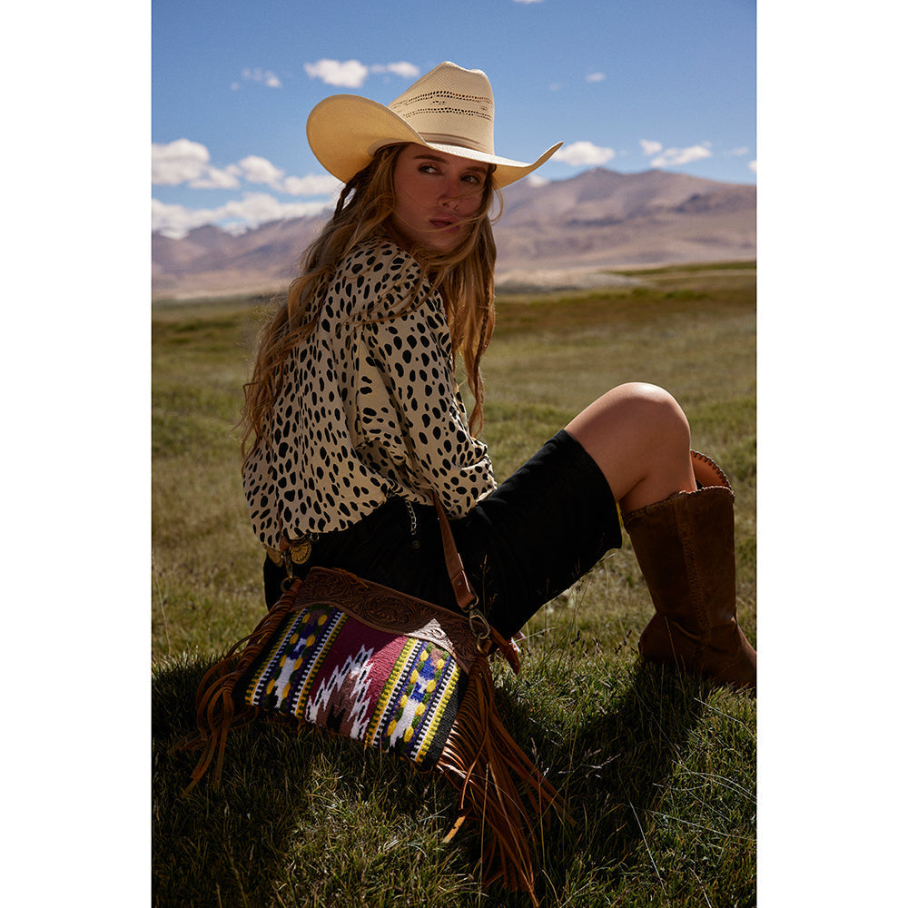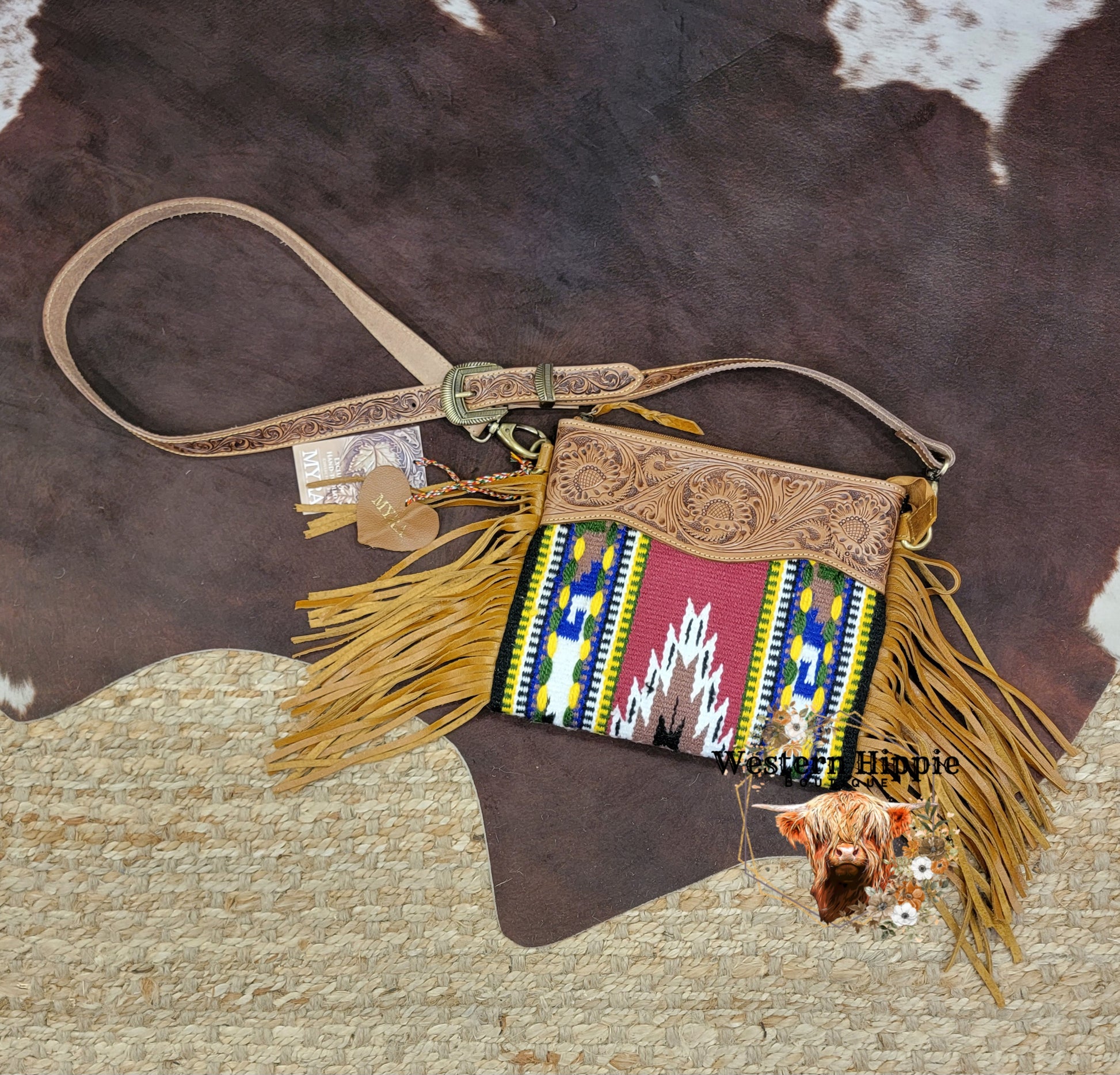 Utterly eye-catching! This gorgeous crossbody bag is a fusion of artisanal craftsmanship and sustainable style. This unique bag features embossed leather detailing and vibrant patterns from an upcycled rug, creating a stunning Southwestern-inspired design. Leather fringe drapes from the sides for the final touch. Zipper-close top with detachable, adjustable shoulder strap in matching leather. It's the perfect accessory for free-spirited women who value both fashion and eco-consciousness!
