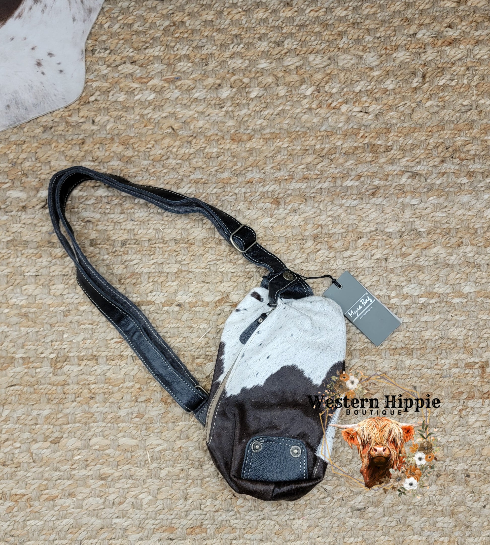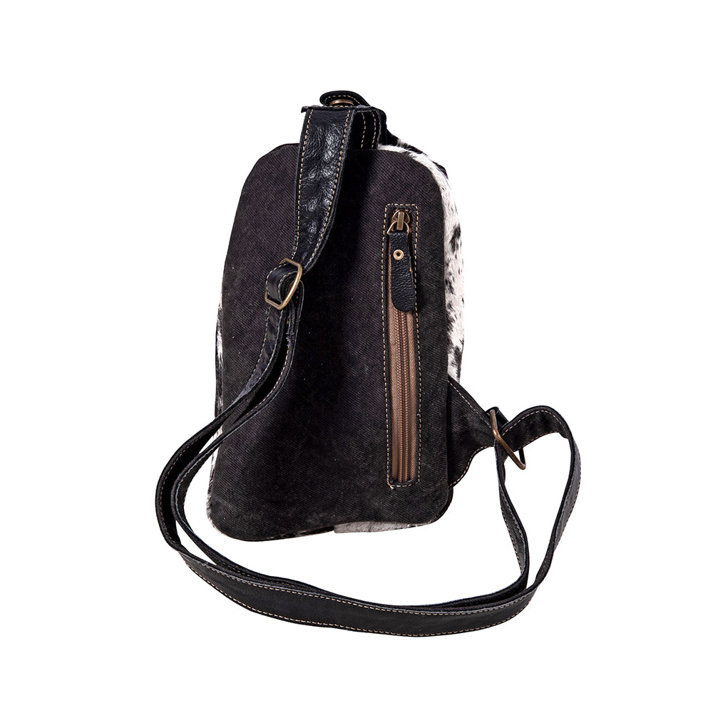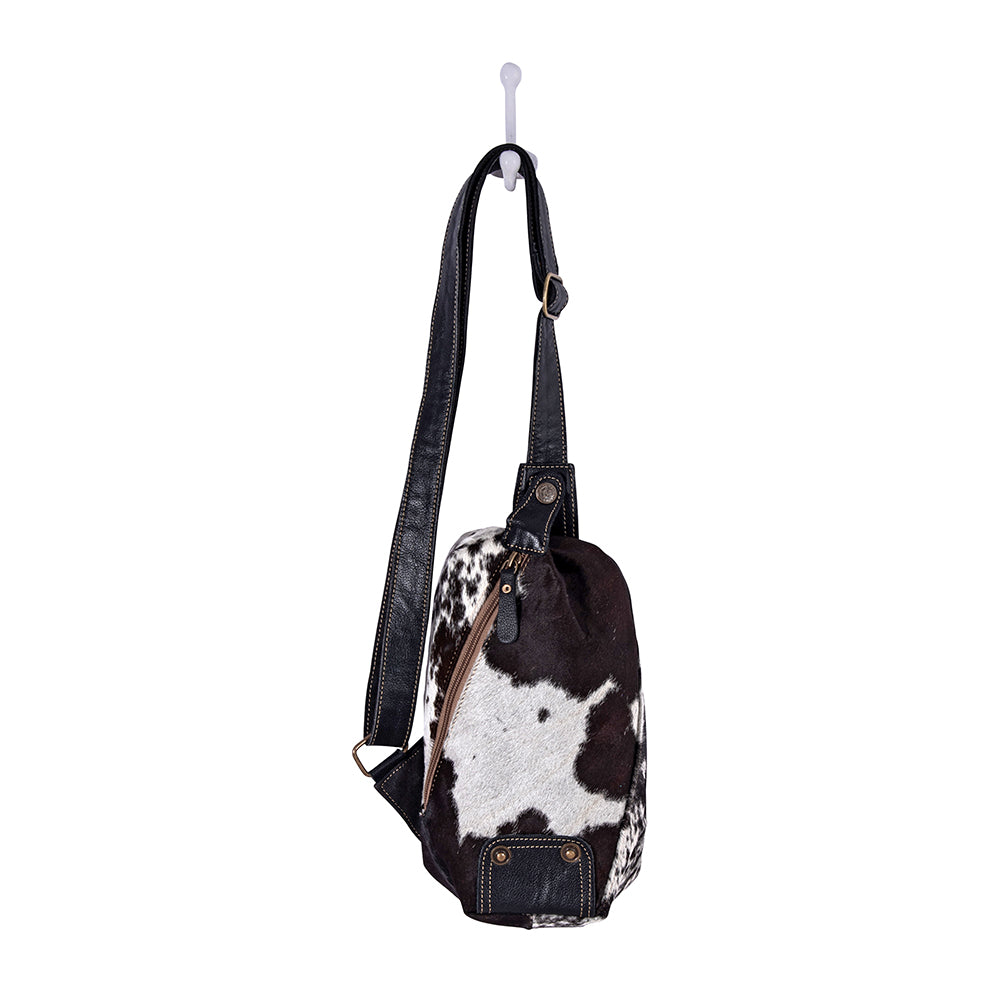 As unique as you are, this compelling hair-on hide sling bag is sure to be your favorite while you’re on the go every day. Features a roomy central interior, and a convenient exterior zippered pocket. Back is rich brown canvas with extra zippered pocket. Includes a hand clasp for adding extra items, and the shoulder strap is adjustable and detachable on one end for added versatility.