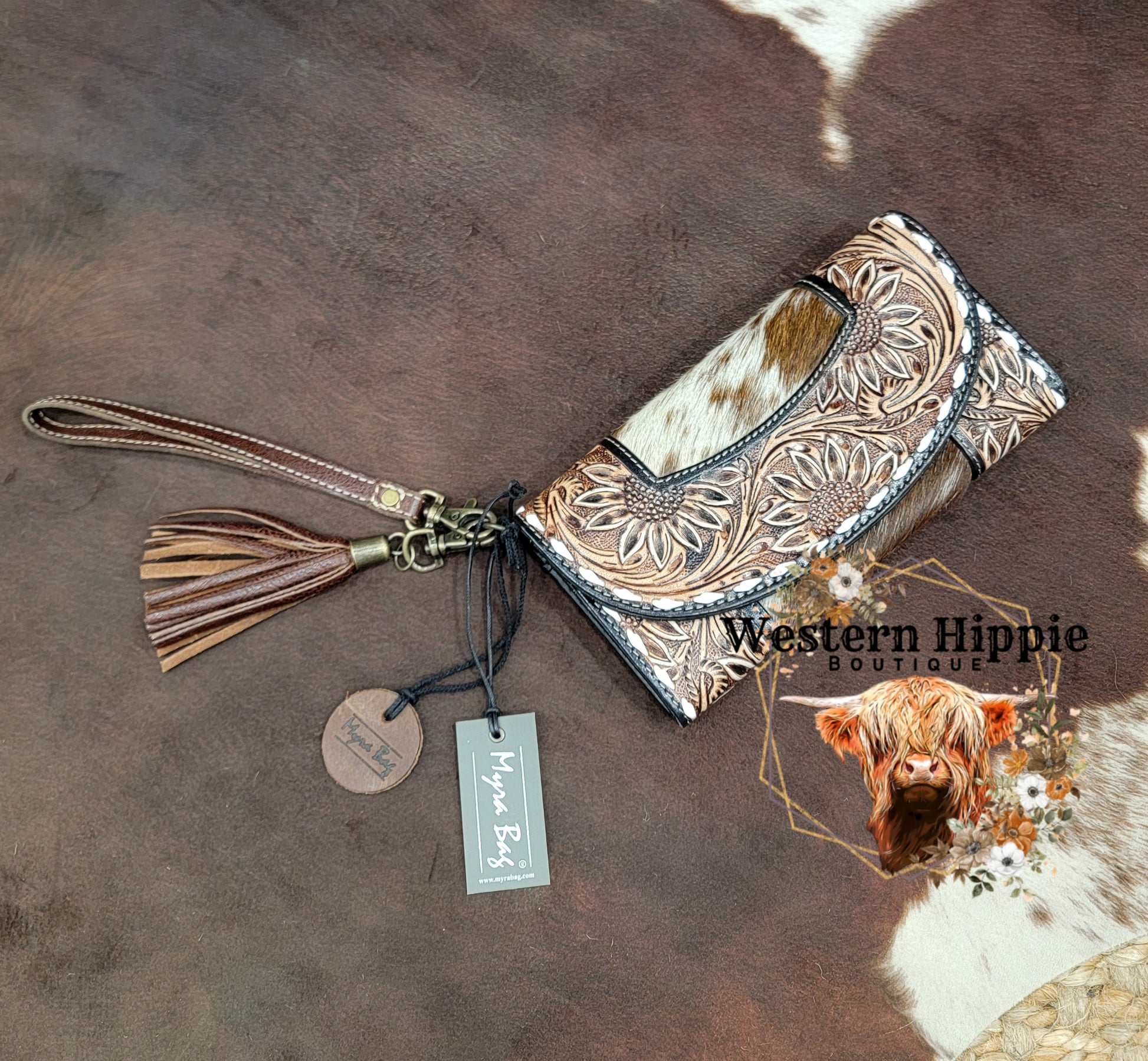 This enchanting wallet features unique hand-tooled leather depicting blooms, all in the company of beautiful hair-on hide. Interior features spacious sections, including a zippered pocket. Snap-close front flap and leather wristlet carrying strap. A cheerful design sure to bring a smile inside and out!