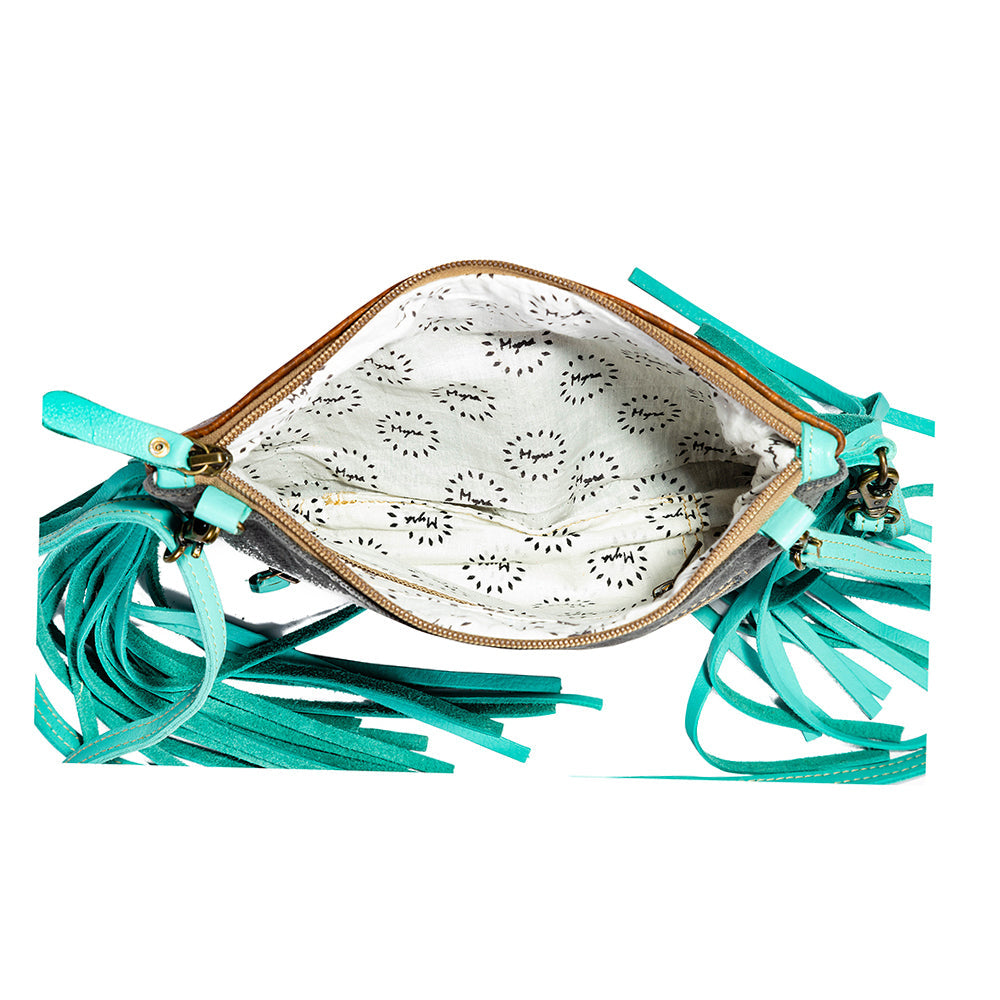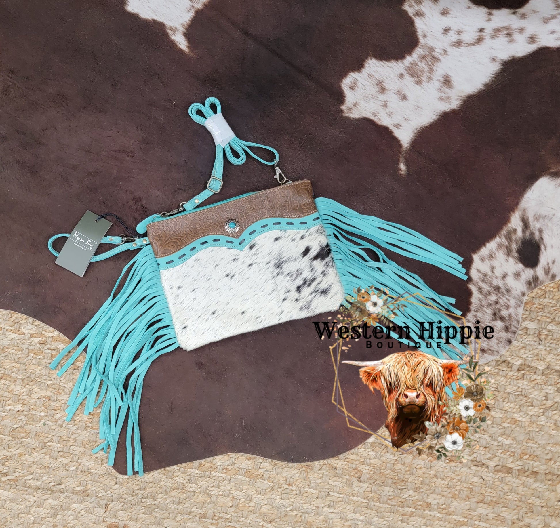 This bag is makes a grand impression with its graceful lines and incredible color combinations! A scalloped top panel of hand-tooled leather in rich caramel compliments the beautiful hair-on hide. An accent in bright Southwest teal leather with ebony leather stitching and a center concho add just the right flair. Matching leather fringe drapes from both sides. The interior features a zippered pocket and zipper close top. The back is smoky charcoal woven canvas with separate zippered pocket. Detachable shoulder strap in matching leather is fully adjustable.