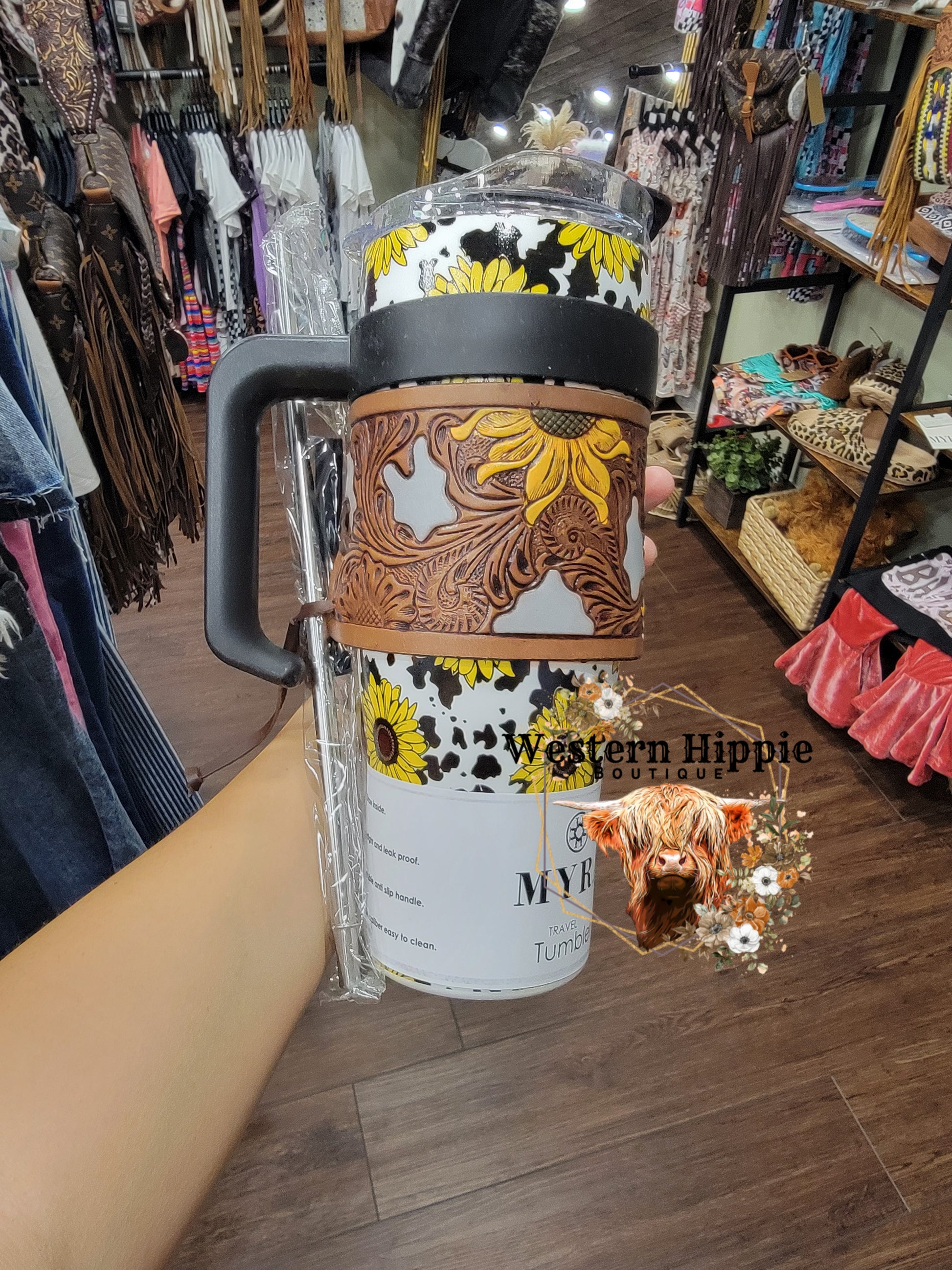 Elevate your daily coffee or beverage ritual with this Western-inspired travel tumbler. Featuring a bold cowhide print and rich tooled leather design wrapped in chocolate brown accents. The ergonomic handle and spill-resistant lid make staying stylish on-the-go effortlessly practical.