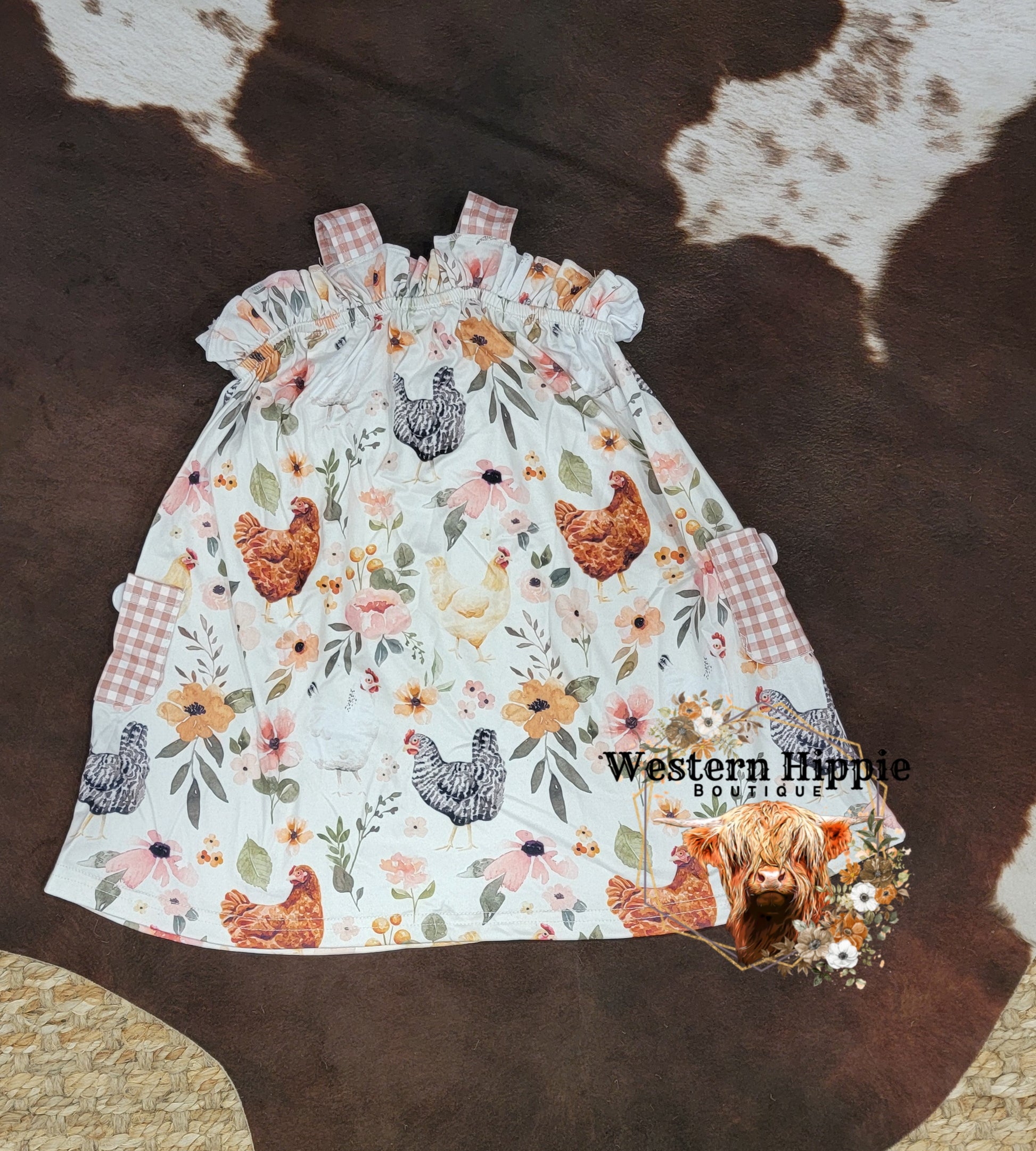 This sweet chicken dress does have pockets! Perfect for your chicken tender to go collect eggs.