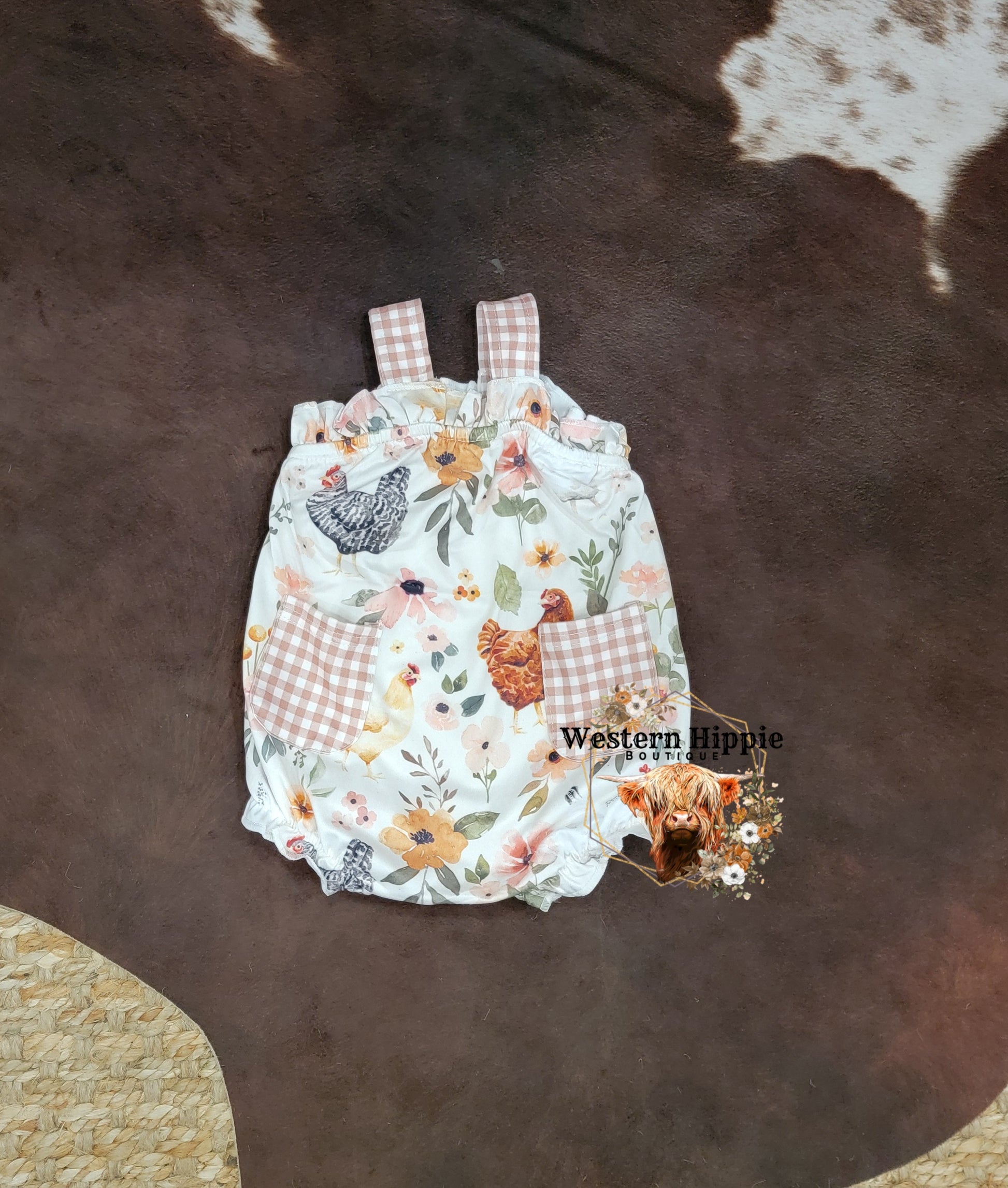 The cutest chicken romper you will ever need. Made with very soft and light weight material. This buttons between the legs.