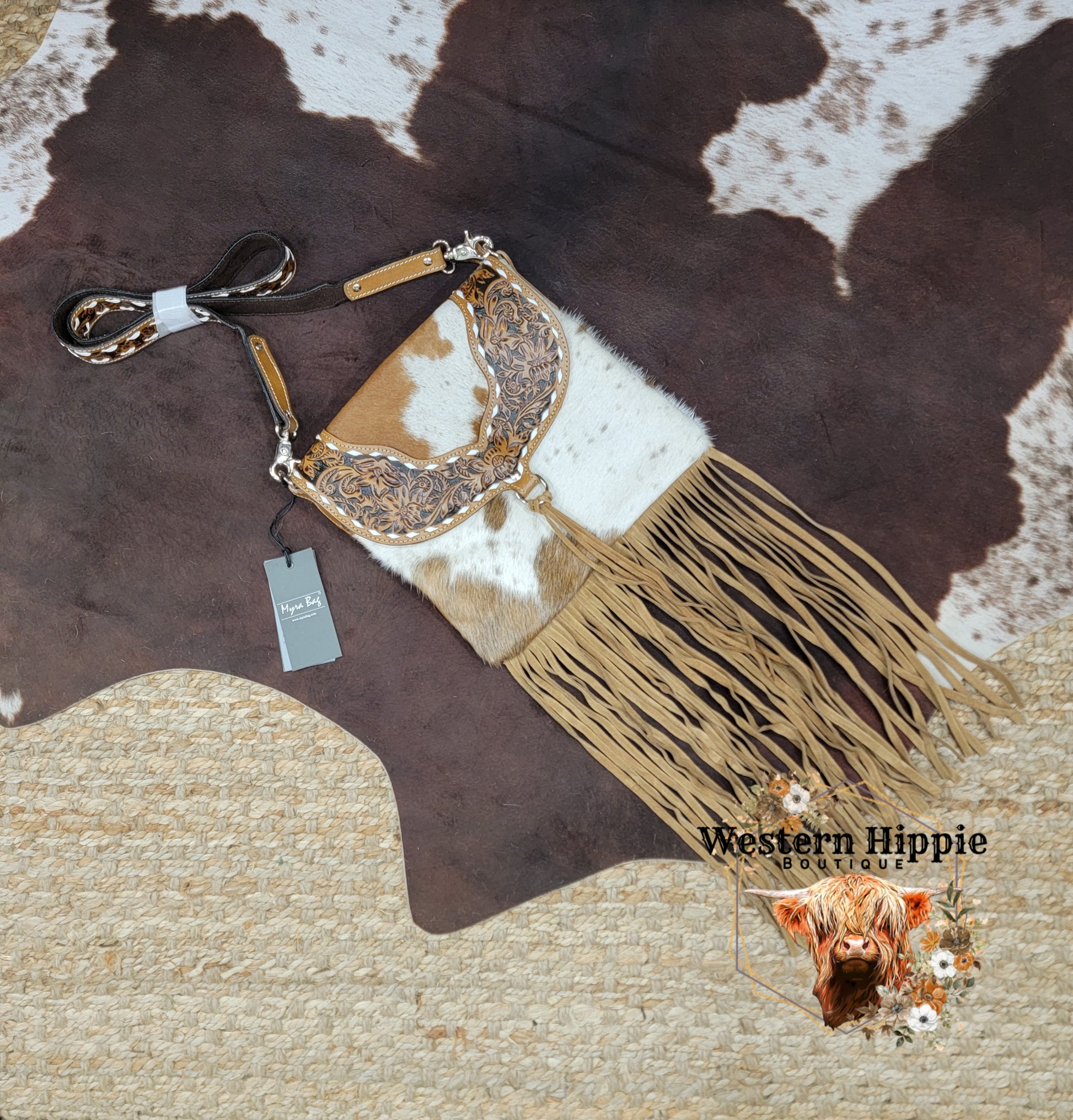 With its lovingly detailed, hand-tooled flap and gorgeous hair-on hide, this fringed bag makes a wonderful fashion statement! The spacious interior features a zipper close top, and the adjustable carrying strap is not only detachable, but is also hand-tooled to match the front flap. The back is beautiful rich caramel leather with separate zippered pocket. A truly splendid bag!
