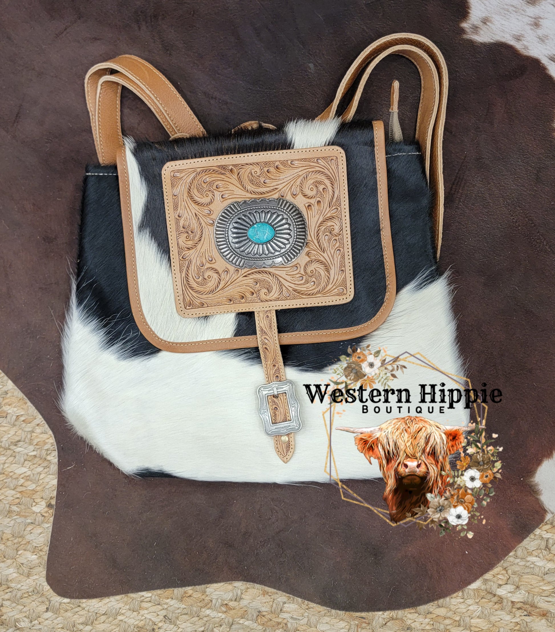 The backpack presents gorgeous hair-on hide with a glorious hand-tooled accent, complete with turquoise-studded concho. The back is a gorgeous warm caramel leather with an extra zippered pocket for convenience. Durable leather shoulder straps and carrying strap are in matching leather. A incredible and stylish bag that you'll adore!
