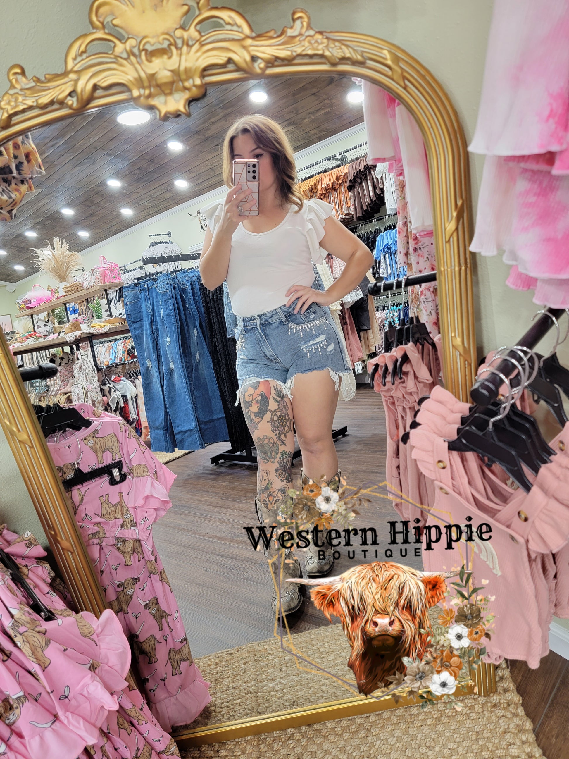 This is a very fitting, soft blouse. The ruffle shoulders make it so fun.