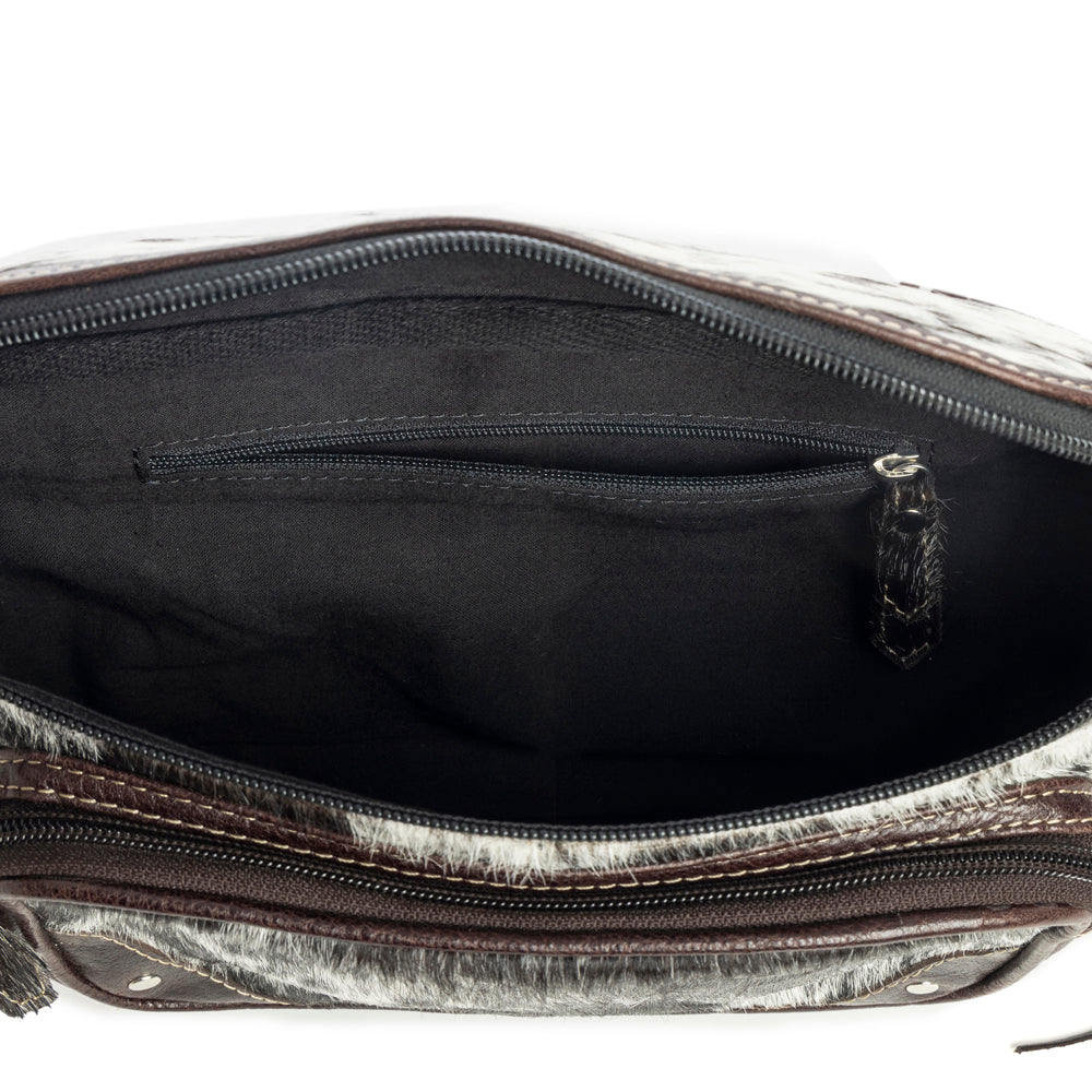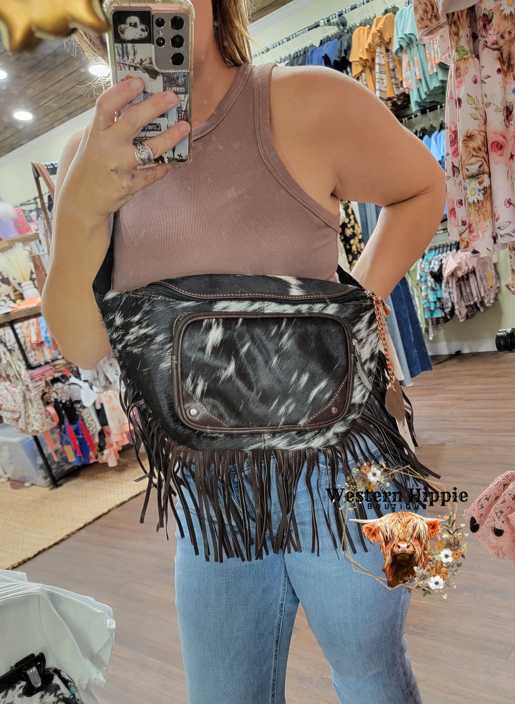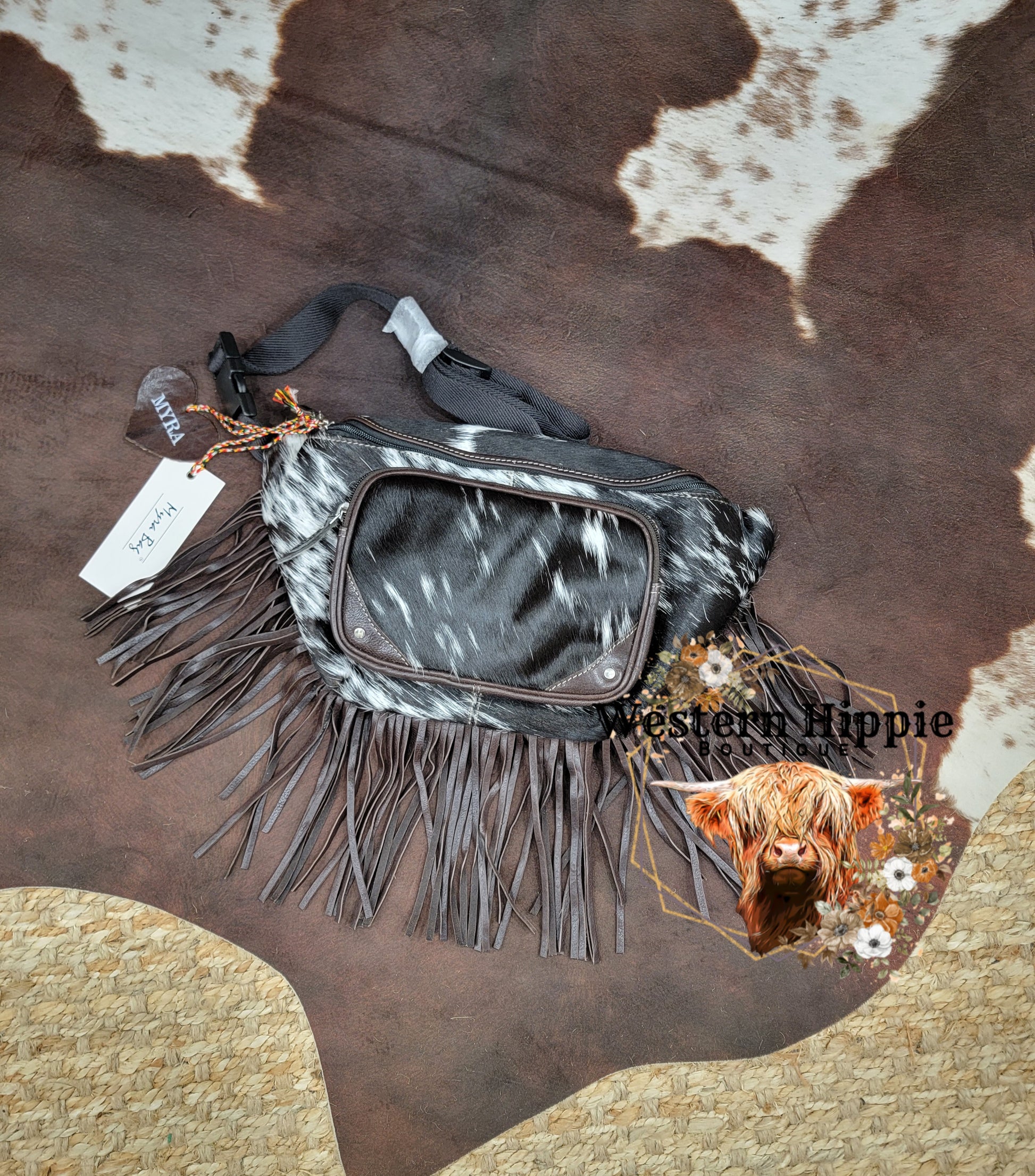Western flair meets urban chic in this eye-catching accessory! It features luxurious black and white hair-on hide, adorned with dramatic fringe cascading from all sides. With its adjustable heavy-duty canvas strap and versatile design, it's the perfect statement piece for the fashion-forward woman, effortlessly transitioning from music festivals to city adventures with untamed style! The leather back has an extra zippered pocket for convenience.